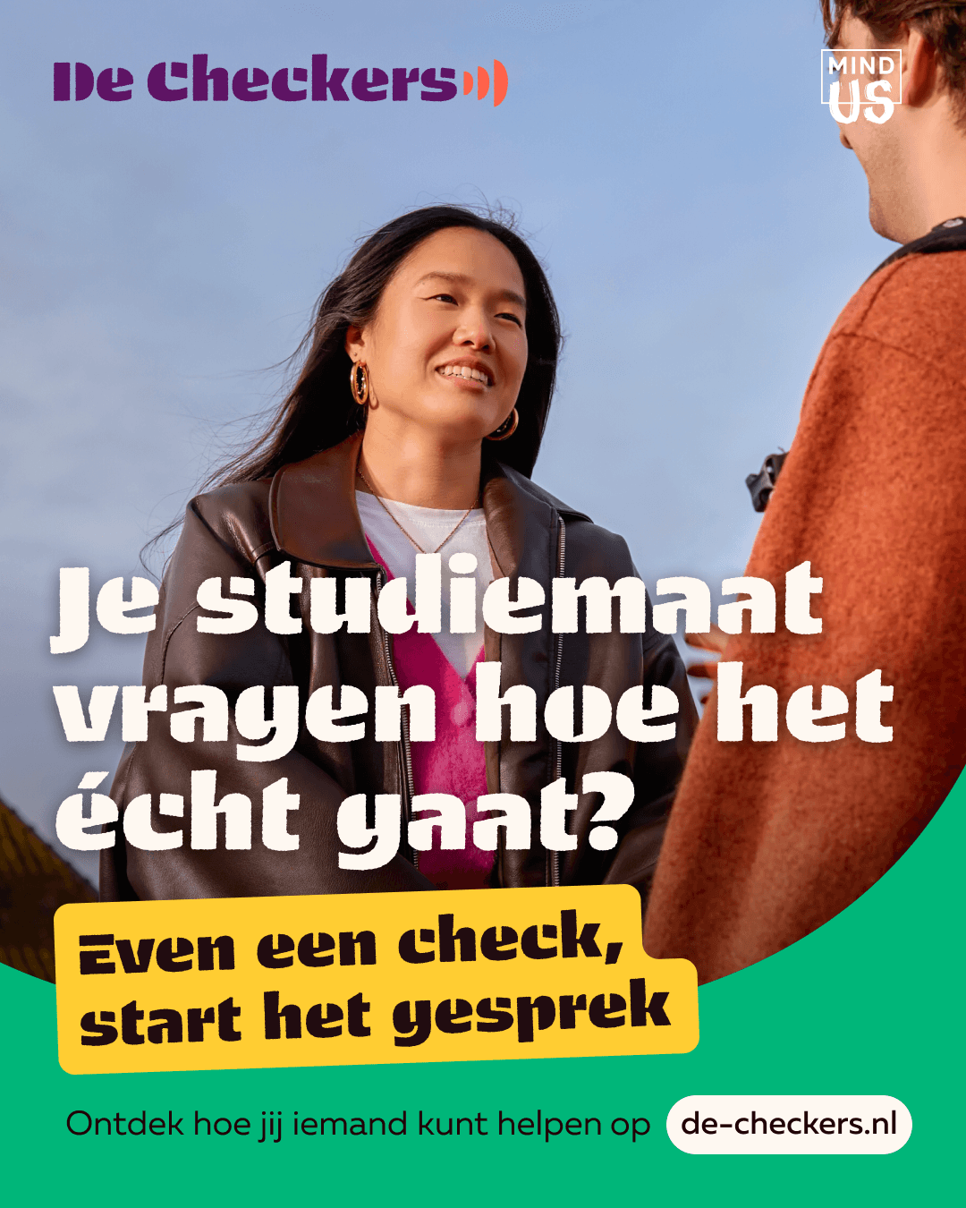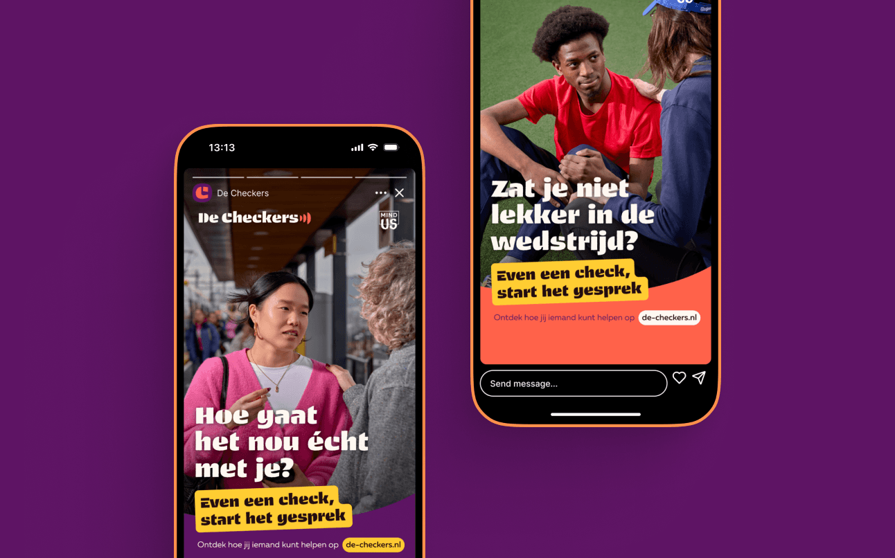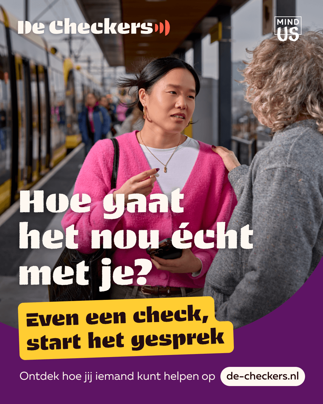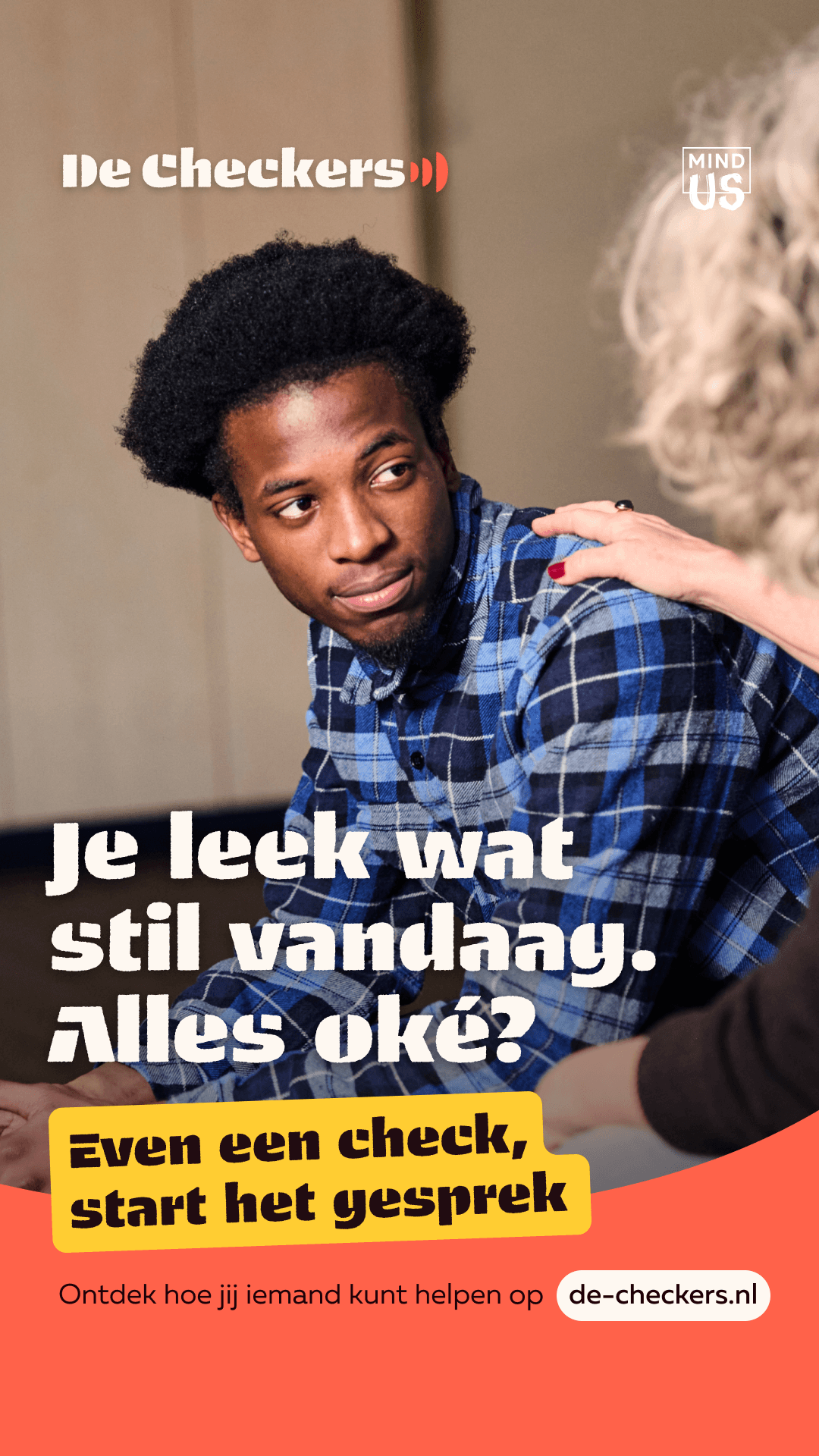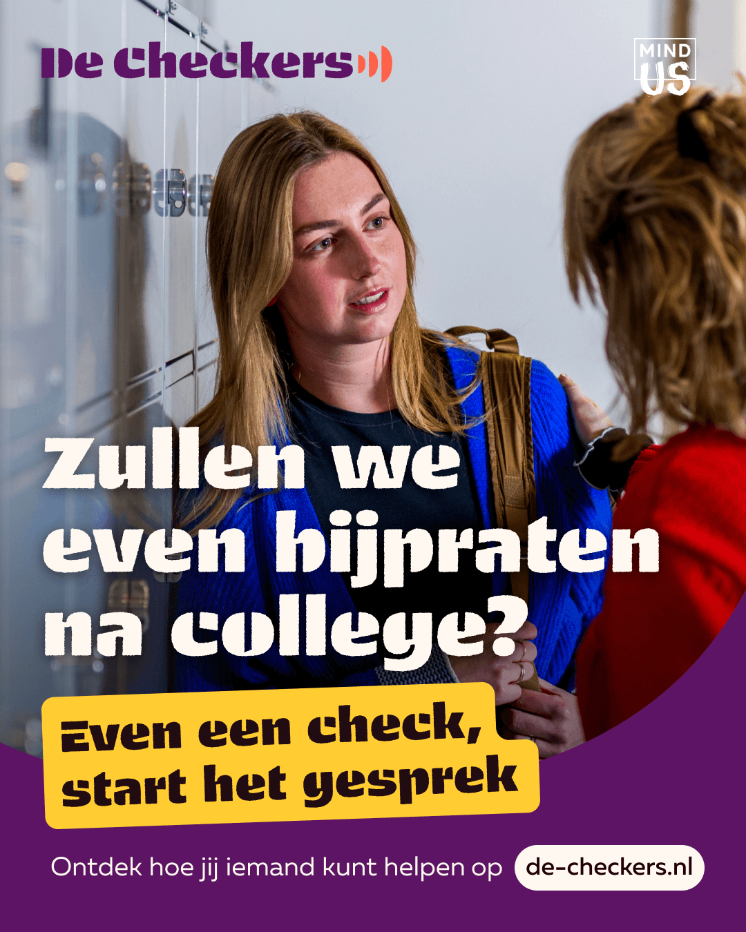 “Even een check, start het gesprek.” (A check in, starts the conversation)
