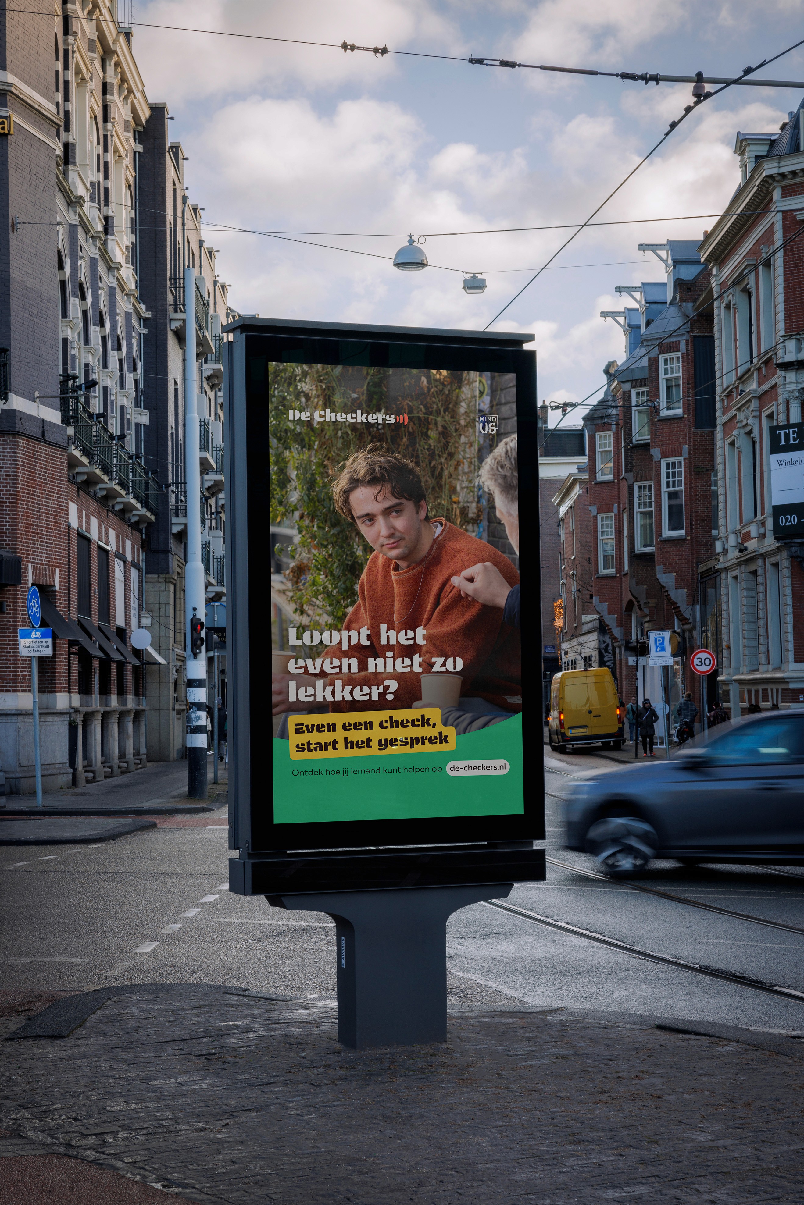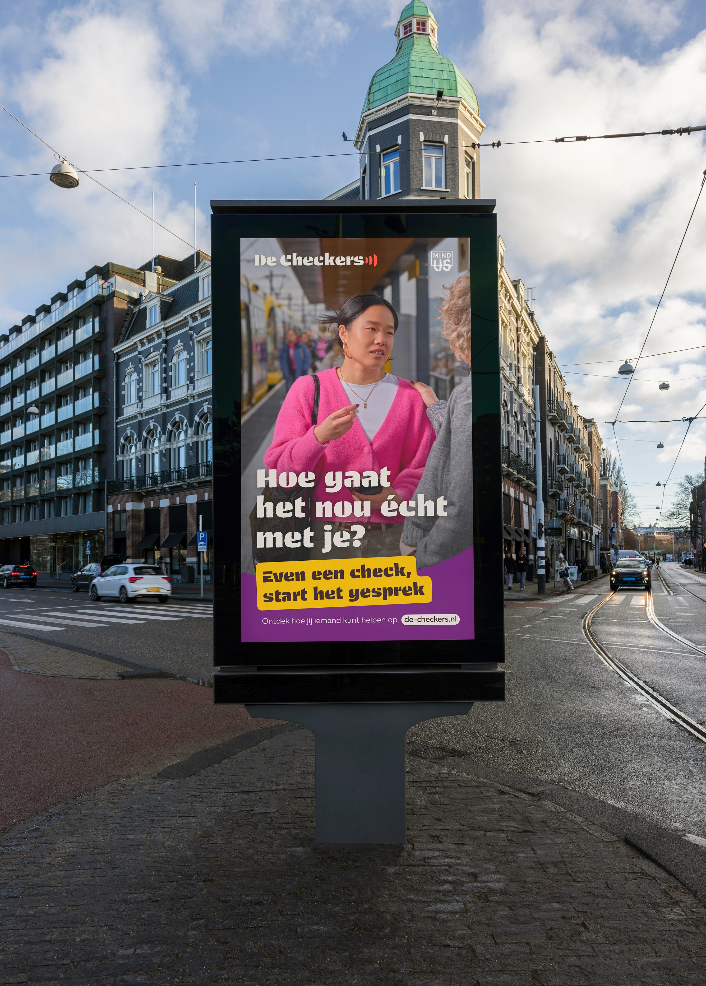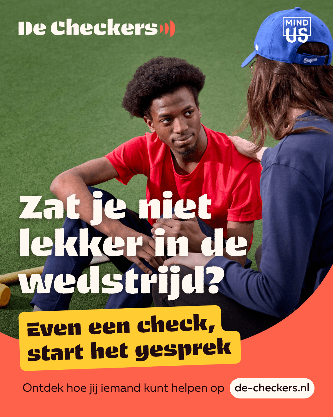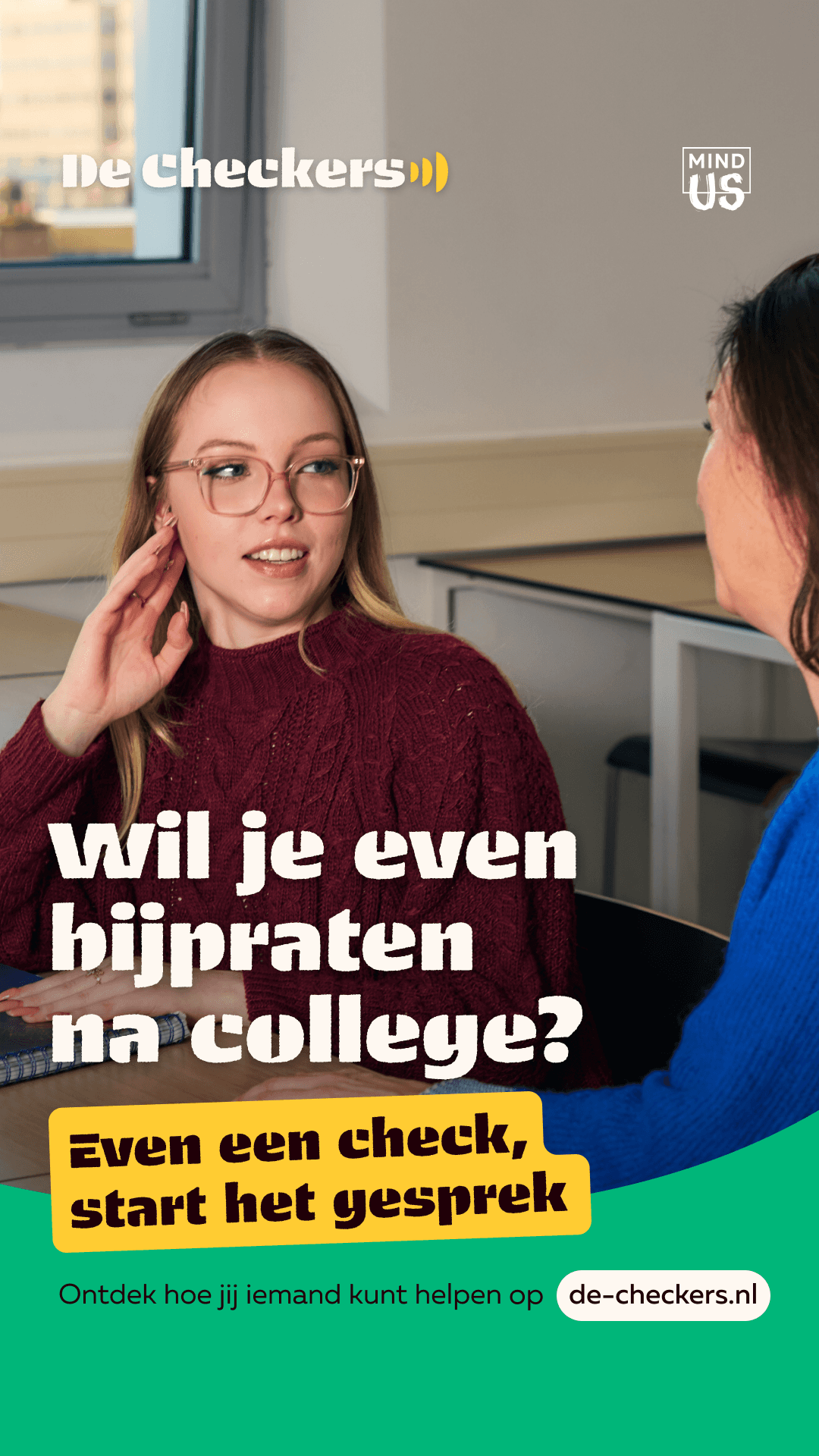 “Even een check, start het gesprek.” (A check in, starts the conversation)